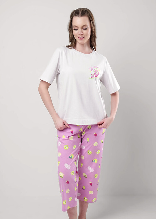 Пижама для дома из хлопкового трикотажного полотна.Футболка прямого кроя, округлая горловина с обтачкой из кашкорсе.Короткий втачной рукав. Бриджы прямого кроя, пояс на внутренней резинке.Боковые карманы с отрезным бочком.