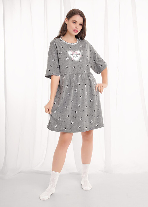 Платье свободного силуэта из хлопкового трикотажного полотна, длиной ниже колена. Короткий слегка спущенный рукав. По горловине обтачка с кружевом. По талии рез с присборенной юбкой. Боковые карманы с отрезным бочком. Спереди принт.