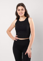 Майка укорченная спортивная из плотного эластичного полотна. Широкая бретель. Круглый вырез горловины. Двойной перед с принтом из черной матовой пленки. По горловине и пройме спинки окантовка.