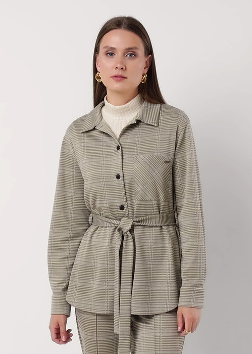 Жакет из трикотажного поливискозного полотна джерси,с застежкой на пуговицы.Отложной воротник.По талии съёмный пояс,шлевкаи. Втачной длинный рукав, внизу манжет на пуговице.Спереди накладной карман, нашивка металл.По спинке кокетка. Фигурный низ изделия.