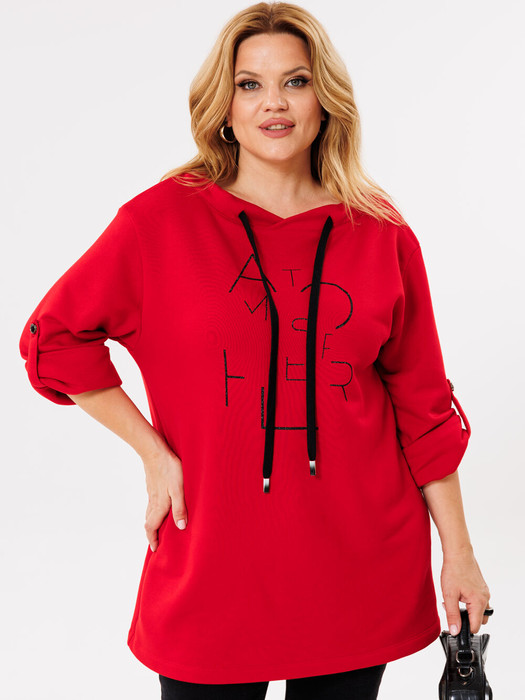 Туника из плотного ,мягкого, комфортного хлопка. Удлиненная прямого силуэта, со спущеной линией плеча, по горловине в планке декоративный шнурок с наконечниками, в боковых швах карманы, акцент сдеоан на дизайнерской печати буквы. Рукав длиной 7/8 с широкой манжетой на пату и пуговицу. Спинка лаконичная. Супер вариант спрот -шик на работу , встречу и для будней.