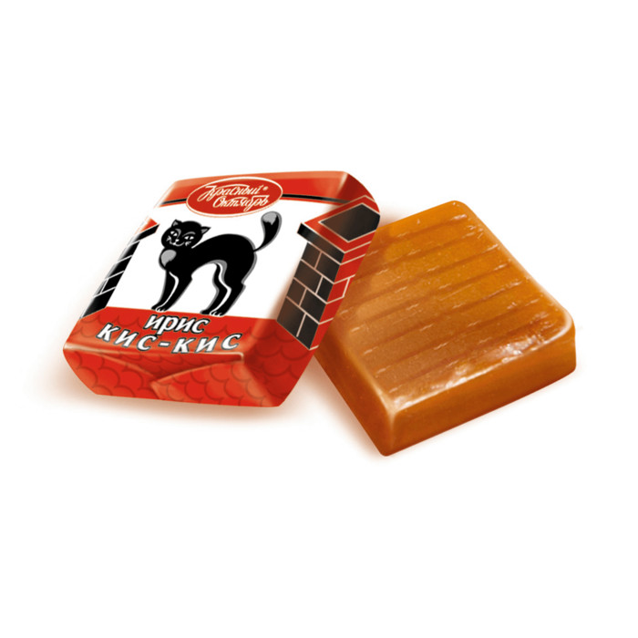 Молочный ирис «Кис-Кис» от фабрики «Красный Октябрь». Знаменитые ириски с нежным сливочным вкусом и яркими карамельными оттенками. Тугие ароматные квадратики в традиционных фантиках с белыми и черными котами, гуляющими по кирпичным крышам.