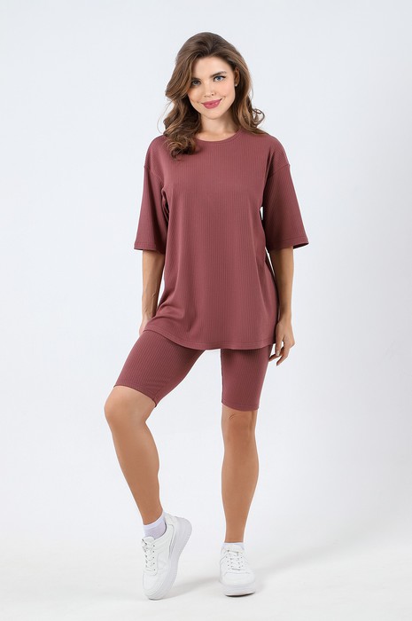 Костюм женский из гладкокрашенного трикотажного полотна в рубчик («лапша»), состоящий из футболки и леггинсов. Футболка – удлиненная, свободного покроя, со спущенной, линией плеча, короткими втачными рукавами, горловиной овальной формы, обработанной втачной планкой.Леггинсы – длиной до колен, с эластичной тесьмой по талии.