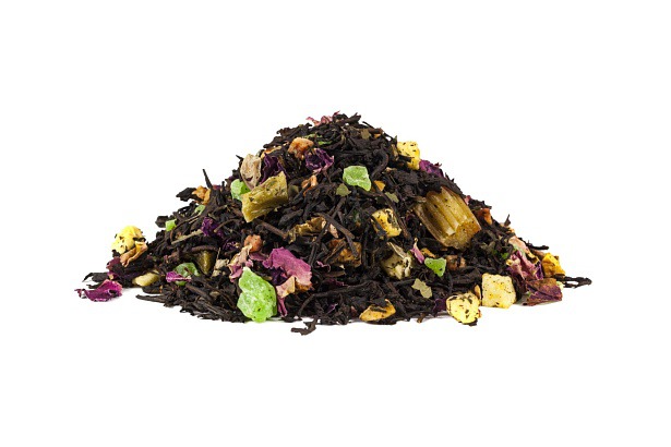 Чай чёрный крупнолистовой с добавлением кубиков клубники и яблок, цукатов ревеня, листочков грецкого ореха. При заваривании получается напиток с мягким вкусом с приятной кислинкой и со сладковатыми нотками клубники и ревеня на послевкусии. Состав: купаж чёрного чая, кубики ананаса, цукаты ревеня, кубики яблока, лист грецкого ореха, сублимированная клубника, лепестки красной розы, ароматизаторы.