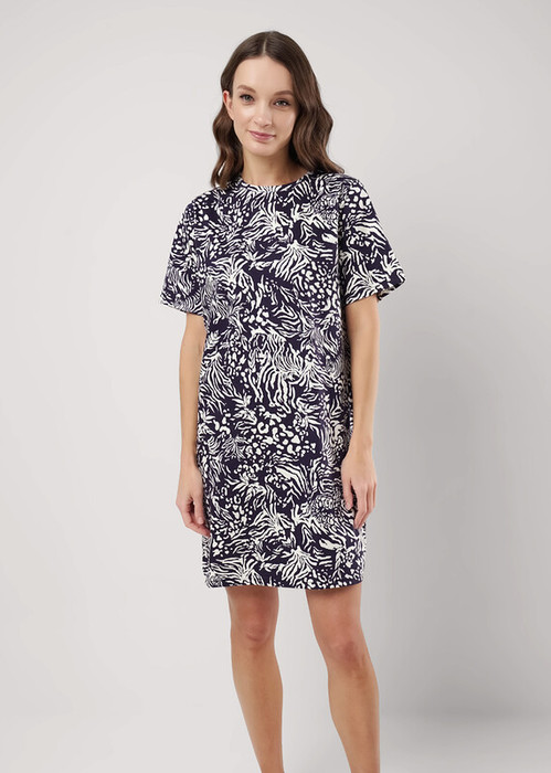 Платье-футболка для дома прямого силуэта, из хлопоковго трикотажного полотна . Короткий втачной рукав. Округлая горловина с обтачкой.