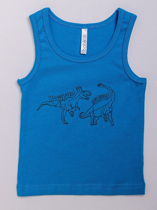 Майка для мальчика синяя с принтом в виде динозавра трикотажная из супрема пенье. Майка из хлопка, прямого кроя, на широких лямках идеально садится по фигуре, мягко облегает, хорошо тянется и держит форму. Модель удобная в носке, а также стильная и эффектная.Характеристики:Ткань: Супрем пенье 92% хлопок 8% эластанПроизводитель: batik
