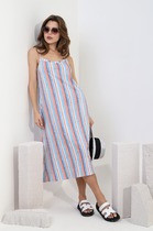 Сарафан молодежный из тканого штапельного полотна с набивным рисунком, слегка расширенный книзу, на узких бретелях, вытачанных из окантовки, двумя вытачками в области груди и оборкой по низу. Вырез горловины по переду и спинке и проймы окантованы основным материалом.