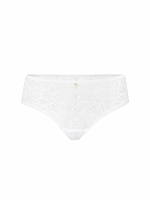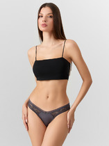 Кружевные трусики модели Hipster со средней посадкой с увеличенным бочком. Нежная резинка по талии. Подгиб и плоский шов по вырезку ножки спереди и кружевное полотно сзади. Ластовица из хлопка. Декоративная металлическая подвеска с заглавной буквой бренда