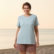 Шорты женские из гладкокрашеного трикотажного полотна «футер-двунитка», удлиненные и расширенные, на притачном поясе с эластичной тесьмой внутри и карманами в боковых швах. Передние половины шорт застрочены по центральным линиям.