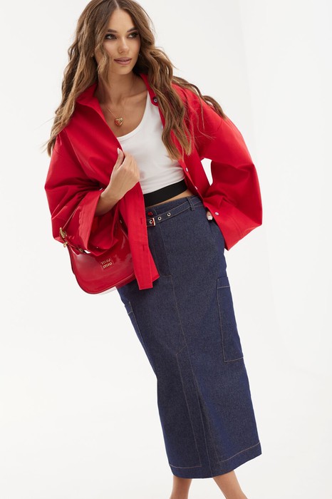 Юбка прямая из джинсовой ткани. Длина миди. Верх на поясе со шлевками. Застежка по переду на молнию и кнопку на поясе. В комплекте съемный ремень.  В боковых швах карманы. По низу переда юбки шлица. На боковых швах накладные карманы.