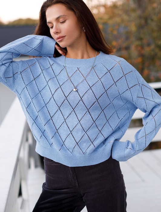 Состав: 100%Хлопок Параметры модели на первом фото: Рост 177, бюст 78, талия 59, бедра 90Укороченный джемпер выполнен узорной вязкой из мягкой хлопковой пряжи. Тонкий ажурный трикотаж идеально подходит для теплой весны и лета, в нем будет комфортно и не жарко. Изделие дополнено фирменным логотипом бренда. Сочетается в костюме с юбкой D36.013 и очень хорошо со светлым денимом.