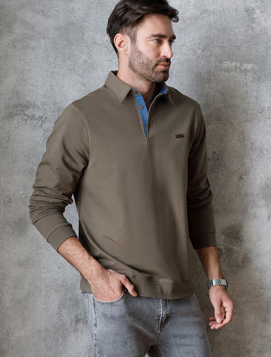 Джемпер с воротом поло выполнен из эластичного футера. Застежка планка дополнена пуговицами с логотипом бренда. Мягкий и плотный материал хорошо пропускает воздух, а наличие ПЭ в составе способствует формоустойчивости и легкости изделия. На груди фирменная нашивка из эко-кожи.
