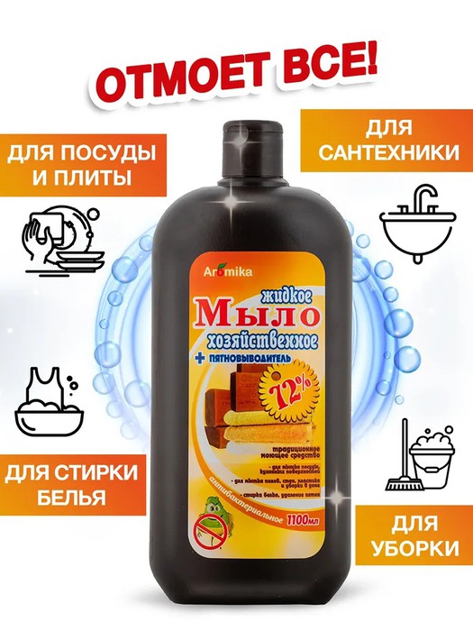 Жидкое антибактериальное хозяйственное мыло 72% для уборки кухни, дома, мытья посуды, стен и пола, гель для стирки белья. Легко удаляет сильные загрязнения, стойкие жировые отложения, эффективно борется с пятнами. Используется для обезжиривания и дезинфекции любых поверхностей.