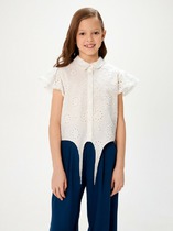 Блузка белая для девочки с длинными рукавами и декоративными оборками. Застежка на петли пуговицы. Модная блузка с отложным воротником обеспечит школьнице полный комфорт во время уроков и на перемене.Характеристики:Ткань:Сорочечная ткань (хлопок 97%, спандекс 3%) Производитель: batik