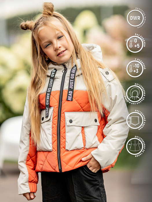 Стильная укороченная куртка Софи эргономичного кроя в оранжевом цвете. Курточная ткань с сочетанием контрастных оттенков color-block с водоотталкивающей пропиткой DWR обеспечит комфорт в весеннюю непогоду. Спереди асимметричные накладные карманы. Принтованная тесьма регулирует объем капюшона, плечи украшают декоративные погоны на заклепках.   Особенности:  Водоотталкивающая пропитка материала DWR Регулировка объёма капюшона Внутренний карманРегулировка по низу курткиРегулировка по талии Характеристики:Ткань верха: Курточная тканьПодклад: полибрушед (полиэстер) Утеплитель: слайтекс 100 гр Температурный режим от +5 до -10 СПроизводитель: batik