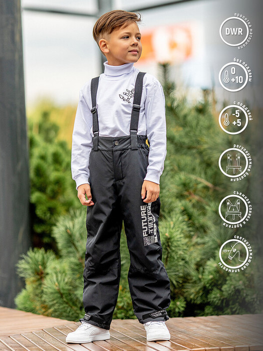 Брюки для мальчика Вегас демисезонные утепленные в темно-серой расцветке. Брюки-полукомбинезон для детей подойдут на весну и осень. Имеют эластичную талию и регулируемые съемные лямки. Подойдут для прогулки, занятий спортом, школы и детского сада. Особенности: Регулируемая талия Съёмные бретели Объёмные карманы на молнии Низ утягивается на декоративную пату и велкро для трансформации в джоггеры Светоотражающие канты и термотрансферы Водоотталкивающая пропитка ткани DWR Характеристики:Ткань верха: Мембрана Подклад: таффетаУтеплитель: 60 слайтекс Температурный режим от +10 до -5 СПроизводитель: batik