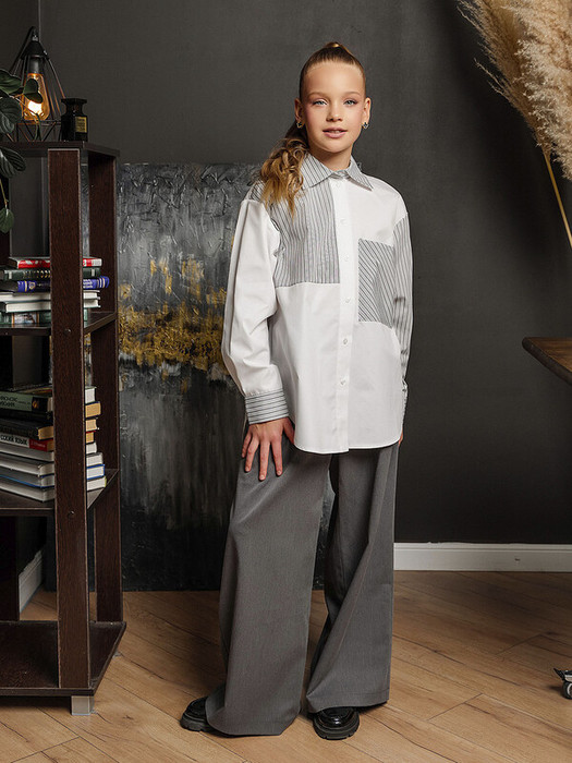 Детские брюки-палаццо серые свободного кроя. Спереди складки, боковые карманы. Классическая застежка "гульфик". Можно носить с отворотом пояса.Характеристики:Ткань: хлопок 60%, полиэстер 40%Производитель: batik