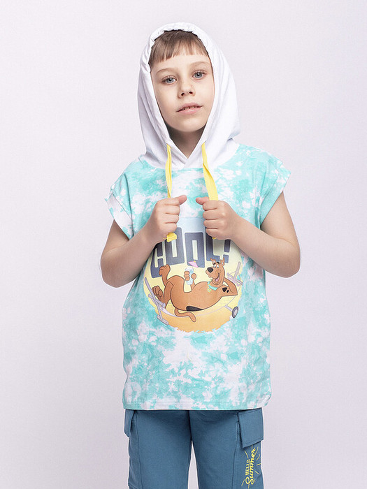 Футболка для мальчика с короткими рукавами и капюшоном. Бирюзовый цвет, принт со Скуби Ду.