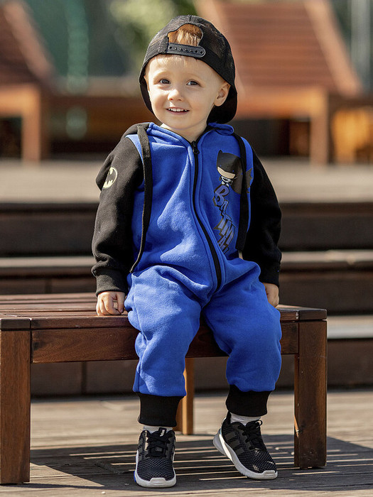 Комбинезон из футера детский Дэн черно-синий. Капюшон с ушками, застежка на молнию, термотрансферы с Бэтменом.