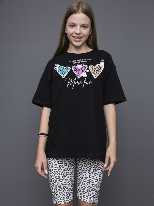 Мягкий и комфортный пижамный комплект для девочки. Состоит из черной футболки с коротким рукавом и шортиков в модном бежевом оттенке с леопардовым принтом. Нежная ткань – приятная к телу, не вызывает раздражения. Резинка на шортах не давит, футболка легко надевается. Идеально для дома, поездок и сладких снов.Характеристики:Ткань: Супрем пенье 100% хлопокПроизводитель: batik