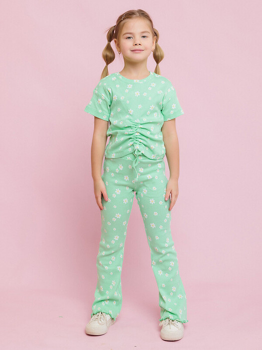 Комплект трикотажный для девочки: футболка с коротким рукавом и брюки. Комплект одежды из трикотажного полотна высокого качества — кашкорсе. Нежная мятная расцветке и принт в виде ромашек. Футболка имеет сборку спереди, брюки кроя клеш.Характеристики:Ткань: Кашкорсе 95% хлопок 5% эластанПроизводитель: batik