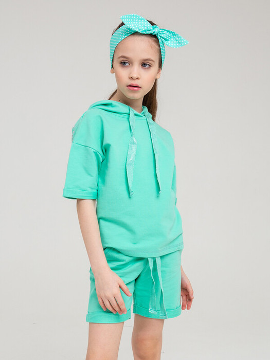 Комплект трикотажный на девочку: пуловер и шорты в мятной расцветке. Материал изделий - футер.Особенности:Пуловер укороченный с капюшономШнурок в капюшонеШорты с эластичным поясом и карманамиХарактеристики:Материал: футер 2х ниткаСостав: 95% хлопок, 5% эластанРазмеры: 146 - 164Производитель: batik
