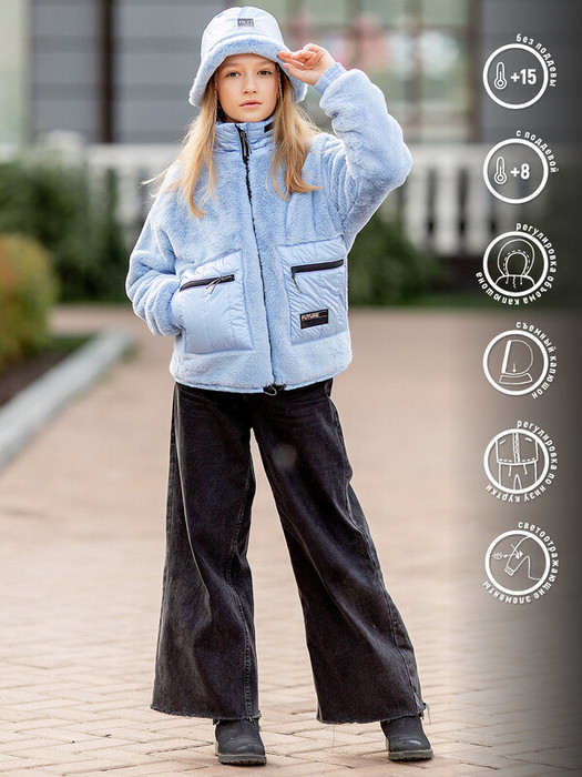 Куртка меховая для девочки Веста голубая без утеплителя. Куртка выполнена из плюшевого искусственного меха с мягким ворсом. Прямой крой, капюшон, застёжка на молнию, два кармана.