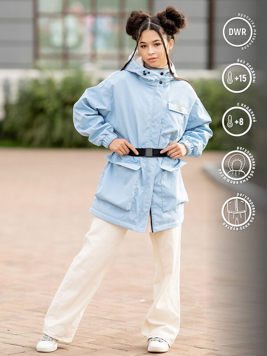 Парка-ветровка для девочки Валенсия в нежной голубой расцветке. Стильная парка без утеплителя фасона оверсайз с приспущенной линией проймы. Центральная застёжка на молнию с внешней ветрозащитной планкой. Низ рукавов на эластичной резинке. Спереди два накладных кармана с листочкой.