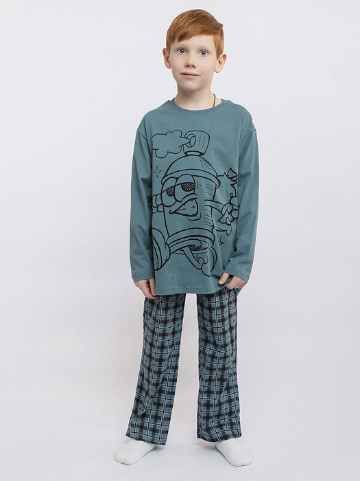 Пижама для мальчика из супрема: футболка с длинным рукавом и брюки. Стильный пижамный костюм понравится ребенку любого возраста. Он отлично подойдет для уютного ночного сна и повседневной носки. Футболка кроя оверсайз с принтом в виде баллончика. Брюки прямого кроя в клетку на резинке.Характеристики:Ткань: Супрем пенье 100% хлопокПроизводитель: batik