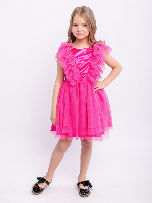 Нарядное платье с пышной юбкой и рюшами из фатина, с декоративным бантом на поясе сзади. На спинке имеется поясок, чтобы дополнительно утянуть талию. Подкладка 100% хлопок.
