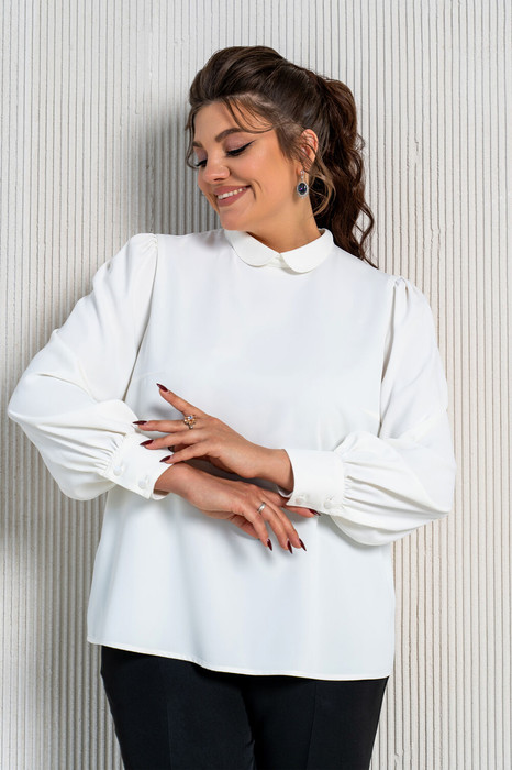 Оригинальная блузка из приятной струящейся ткани может превратить обычный повседневный костюм в праздничный наряд, а съемный цветок придает образу очарование и актуальность. Блузка прямого силуэта с застежкой на спине на одну пуговицу и навесную петлю. Вырез горловины оформлен небольшим отложным воротником со стойкой. Спинка без особенностей. Рукав втачной длинный со сборкой и манжетой по низу. Застежка манжеты на 2-е петли и пуговицы.