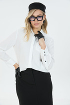 Блуза женская свободного силуэта с фигурным низом. Вырез горловины круглый. Низ переда собран на пояс из основной ткани. Рукав втачной на резинке.