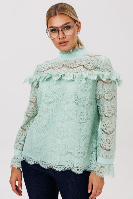 Кокетливая блуза с нотками романтизма выполнена из плотного кружевного полотна. Её прямой силуэт украшен изысканными конструкторскими деталями: отрезные кокетки по переду и спинке мягко подчеркнуты воланом, а воротник-стойка и королевские манжеты на рукавах декорированы ажурной кружевной отделкой. Застёжка на пуговицы, расположенная по задней стойке, добавляет модели особый шарм.