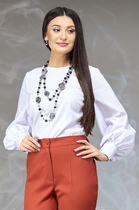 Блузка приталенного силуэта с вырезом горловины квадратной формы. Перед и спинка с рельефами. По спинке средний шов, в котором вставлена потайная молния. Рукав втачной длиной 3/4, по окату присборен на резинку, в нижней части рукава сборка на венгерку.