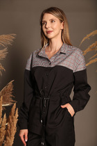 Блузка прямого силуэта. Горловина обработана отложным воротником-стойкой, по переду расположены симметричные складки и декоративная капелька, по спинке с застежкой на навесную петлю и пуговицу. Спинка со средним швом. Рукав втачной прямой длинный, по низу со сборкой и манжетой с застежкой на петли и пуговицы.