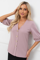 Блузка свободного кроя, выполнена из полупаразрачного полотна белого цвета. Прмой свободный крой, рукав широкий вточной, низ присборен на фигурную узкую манжету, V-образный вырез, лиф отрезной по лини талии, застежка центральная на шнурки-завязки. Длина по спинке 62см, длина рукава 61см.
