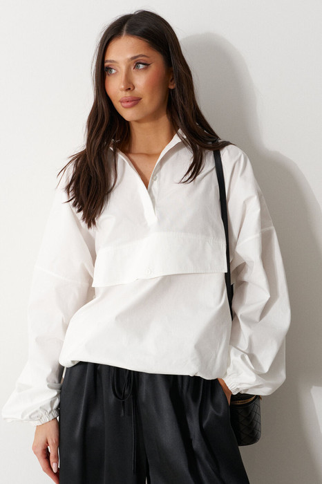 Блузон прямого свободного кроя выполнен из хлопковой ткани. Характеристики: отложной воротник, застежка центральная на петли пуговицы, по переду имитация кармана. Низ изделия на резинке с фиксатором. Плечо спущенно, рукав свободный, низ рукава на резинке. Длина по спинке 71см, длина рукава от края горловины 81см.