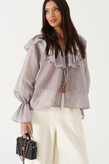 Блузка женская прямого силуэта, широкая. Выполнена из полупрозрачной ткани с вышивкой серого цвета. Характеристика: По V-образному вырезу горловины волан. Рукав одношовный, втачной, широкий. По низу цельнокроеная манжета с резинкой (венгеркой). Спинка цельная. Застежка на три ряда завязок. Длина рукава с манжетом 63 см, длина по спинке 59 см.