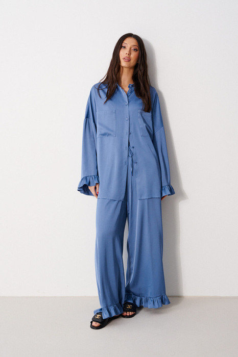 Блузка прямого, свободного кроя, отложной воротник, застежка центральная на петли пуговицы, по переду крупные карманы, в боковых швах разрезы, рукав свободного кроя - спущен, по низу рукава волан выполнен из ткани основного изделия. Длина рубашки по спинке 74 см, длина рукава от края горловины 77 см.