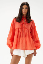 Блузка из хлопкового шитья с V-образным вырезом и втачным рукавом 3/4 со сборкой по окату и внизу на резинке. Полочка с центральной застежкой на завязки. По полочке и спинке по линии талии вставлен волан со сборкой и фигурным низом. Блузка на подкладке из хлопка.
