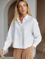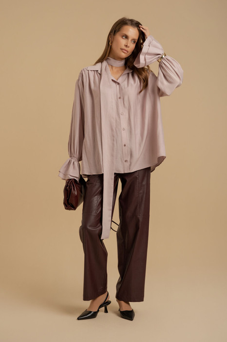 Блузка женская свободного силуэта из легкой плательной ткани с добавлением шерсти. Вырез горловины оформлен воротником рубашечного типа. Застежка - петли с пуговицами. В области кокеток на спинке и передних деталях выполнена сборка. Рукава - втачные со спущенной линией плеча. В области оката выполнена глубокая встречная складка, низ присборен на эластичную тесьму, изделие дополнено шарфом - завязкой из основной ткани.