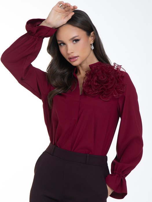 Хит сезона! Необыкновенно красивая и элегантная блуза с изысканным декором- само воплощение женственности. Блузка с изящным цветком из органзы, идеально впишется в любой гардероб: для создания делового образа, повседневного или праздничного. Можно носить как с классическими брюками и юбками, так и с джинсами или под сарафан. Прекрасно смотрится как в заправленном состоянии, так и на выпуск. Шелковистая струящаяся ткань практически не мнется, обладает износостойкостью, обеспечивает идеальный комфорт. Блузка  продуманного и универсального фасона, идеально подходящего под любой низ. Воротник стойка, рукав длинный, на резинке с красивой рюшей по низу