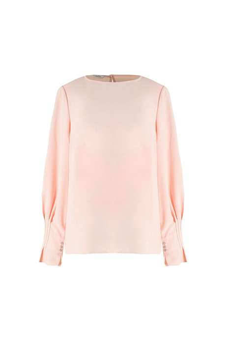Блузка женская, прямого силуэта. Застежка по спинке на петлю и пуговицу. Рукав втачной, по низу с застроченными складками и манжетой, застегивающейся на петли и пуговицы.