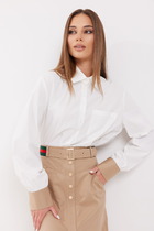 Эффектная блуза прямого силуэта из принтованной ткани, позволит создать необходимый легкий образ. Горловина округлой формы. Декоративным элементом являются застроченные складки от плеча. Застежка по спинке на одну навесную петлю, пуговицу. Рукав втачной, длинный, внизу на притачной манжете с застежкой на пуговицу. В боковых швах предусмотрены небольшие разрезы.