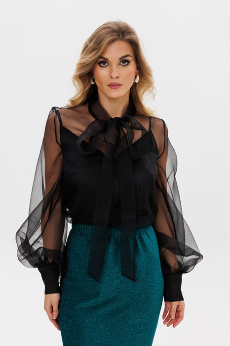 Блузка + топ. Блузка выполнена из органзы. Блузка прямого силуэта, длиной выше линии бедер. Перед и спинка цельные. Спереди прорезь. Воротник-стойка, переходящий в бант. Рукав втачной, одношовный, расширенный к низу и присборенный. Низ рукава на притачной манжете из отделочной ткани, застегивающейся на четыре пуговицы. В комплект входит топ из атласа. Топ на регулируемых бретелях. Перед и спинка топа цельные.