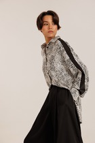 Блузка выполнена из плательно-блузочной ткани с принтом. Блузка прямого покроя, длиной до линии бедер. Спереди застежка с планкой на пуговицы. Спинка цельная. Воротник стояче-отложной. Плечевой шов удлинен. Рукав покроя "кимоно", длиной выше линии локтя.