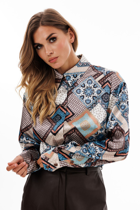 Блузка выполнена из тонкого атласа с принтом. Спереди центральная застежка на потайную планку с пуговицами. Спинка цельная. Воротник стояче-отложной. Плечевой шов удлинен. Рукав рубашечный одношовный. Низ рукава на притачной манжете.