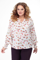 Блузка с втачным воротником с отрезной стойкой, центральной застежкой на петли и пуговицы на планке. Центральная часть полочки с защипами. Плечо спущенное. Рукав втачной, длинный, с отрезной манжетой. По окату рукава встречная складка. По шву притачивания манжеты- сборка.