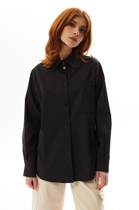 Блузка с застежкой на петли и пуговицы, втачным воротником с отрезной стойкой. По правой полочке- накладной карман. Спинка с отрезной кокеткой. Низ блузки фигурный. Рукав втачной, длинный, с отрезной манжетой.