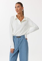 Блузка женская прямого силуэта. По переду обработаны вытачки, застежка притачными планками. Спинка цельнокроеная. По горловине воротник с цельнокроеной стойкой. Рукав длинный одношовный. Воротник и планка выполнены из ткани-компаньона.